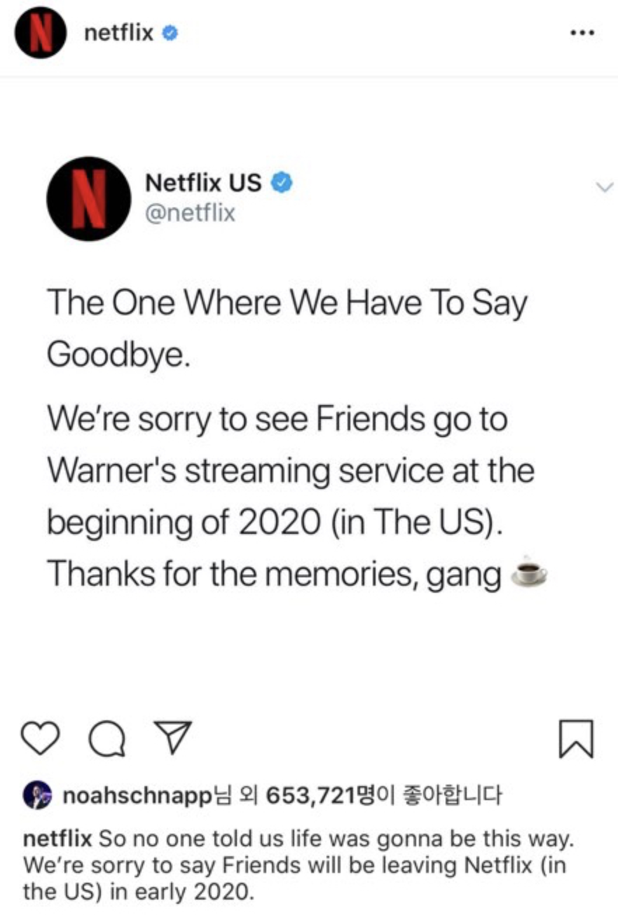 예전부터 프렌즈가 넷플릭스를 떠날 것이라는 소문이 돌 때마다 공식 트위터로 연장했다는 글을 올려 주었지만.. 이번엔 확실히 끝나게 되었습니다. 작년 연말에도 프렌즈가 넷플릭스를 떠난다는 소문이 돌아 한번 난리가 났었는데.. 종료가 되는 시점인 내년에는 넷플릭스 이탈자가 많이 늘어나고 HBO max로 갈아탈 것 같습니다.