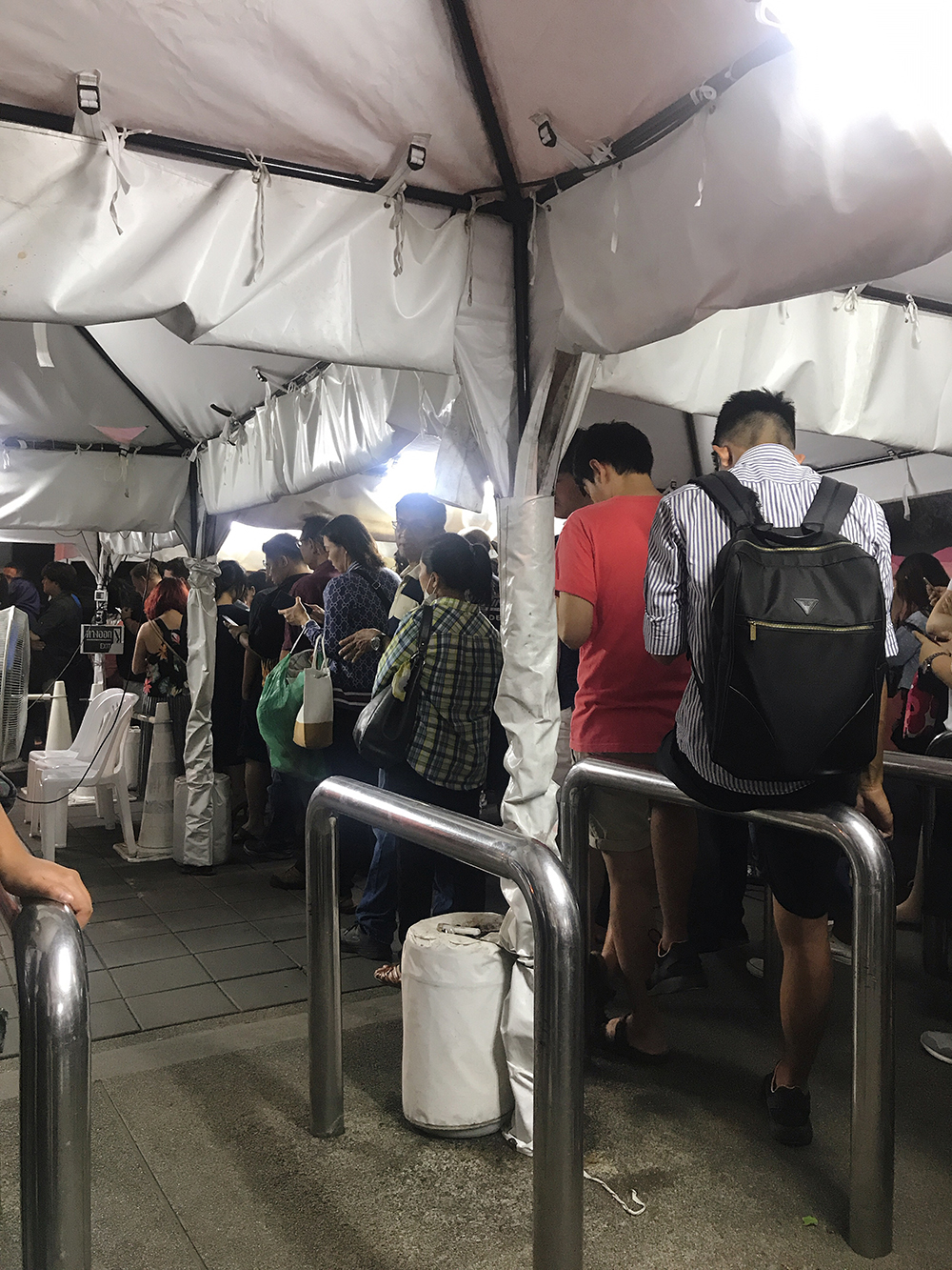 아이콘 시암에 가고자 사람들이 줄을 길게 서있고 교통정리해주는 스텝들이 많아서 길 잃을 일은 없습니다. 아이콘 시암의 무료 셔틀 수상버스는 아침 8시 30분부터 11시 30분까지 운영하고 아이콘 시암은 아침 10시부터 저녁 10시까지 엽니다.