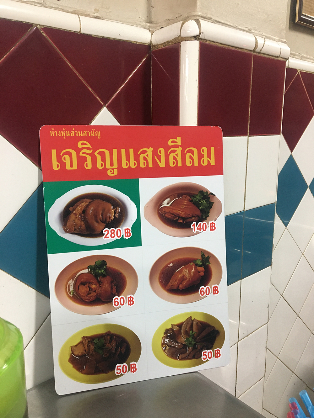 메뉴판은 설명도 없습니다. 그냥 그림이 자리에 서있습니다 ㅎㅎㅎ 살코기 족발 크기, 부위별로 가격이 다르고 아래의 메뉴는 간과 허파? 덮밥입니다. 친구 말로는 족발이 작은 건 양이 꽤 작기 때문에 두 개 먹게 되지 말고 꼭 큰 것을 먹어라의 지시대로(?!) 가장 큰통 족발 280 THB를 시켰고 밥 두 개가 추가되어(밥 하나에 5 THB) 총 290 THB 만 2천 원 나왔습니다. 제일 윗줄에 있는 통족발이 인기 메뉴라고 합니다. 백종원씨가 시킨 사이즈는 140 THB 같았습니다.