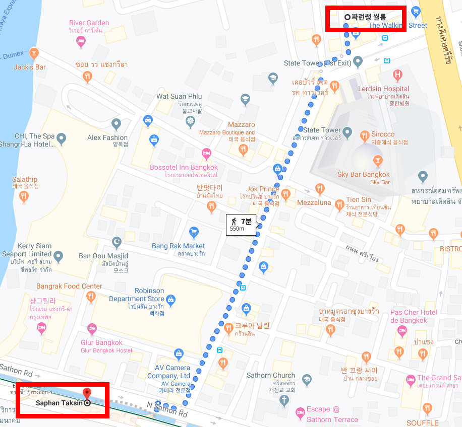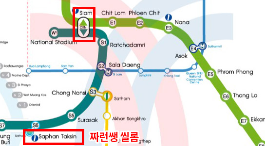 짜런쌩 씰롬은 사판탁신역에서 내려야 하기 때문에 BTS로 시암역에서 갈아타서 사판탁신 Saphan Taksin 역에서 내리시면 됩니다. 같은 BTS기 때문에 따로 밖에 나가 표를 또 끊을 필요 없이 갈아타실 수 있습니다. 사판탁신 역은 아시아 티크나 아이콘 시암을 가기 위한 수상버스(보트)를 타는 역으로 자주 접하실 역입니다.