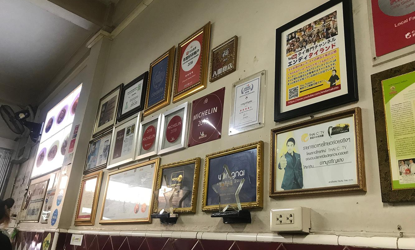 자리에 앉으면 물을 마실 건지 물어보는데 무료는 아니고 유료로 2 THB 추가됩니다. 저는 따로 시키지 않았습니다. 벽면에는 각종 언론사, 미슐랭에서 인증받은 인증들이 붙어 있어, 현지인 음식점이 불안한 저의 마음에 믿음을 실어주고 있습니다.