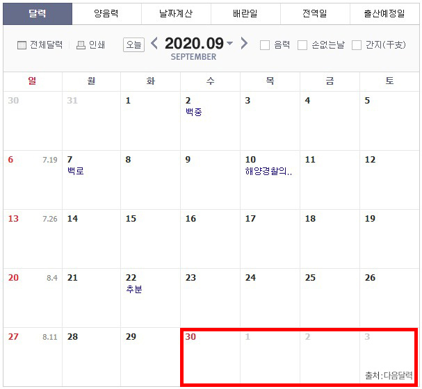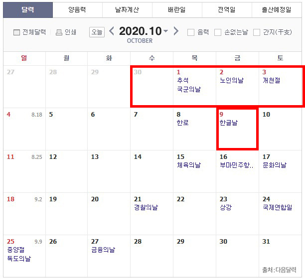 추석 9월 30일 - 10월 2일. (추석에 왜 껴있죠... 개천절 토요일). 한글날 9일.