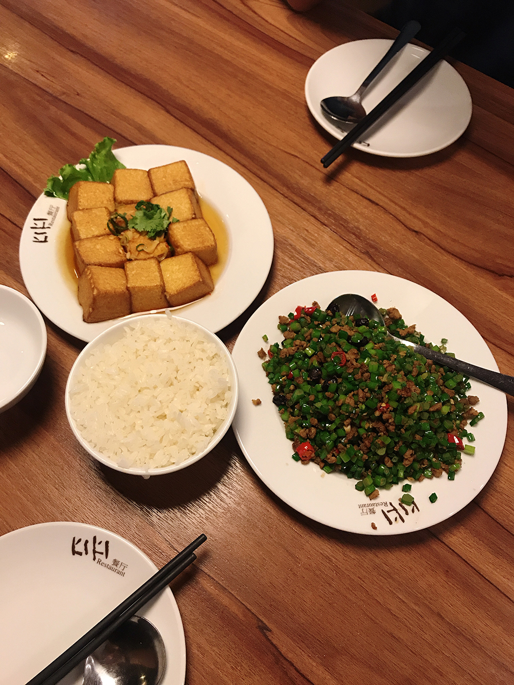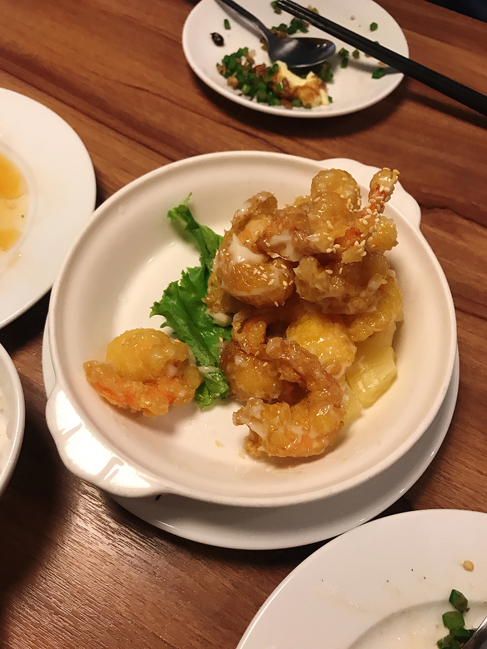 음식이 나왔고 사실 별다른 특이한 음식 같아 보이진 않았는데 먹고 나니 와... 부드러운 두부는 연두부? 같은데 겉은 약간 단단한데 가운데를 가르는 순간 안에는 크림처럼 정말 부드러운 두부가 느껴져요. 정말 맛있더라고요. 파인애플 새우 튀김은 정말 통통하고 맛있었지만 사실 아는 음식 그 맛이에요. 세 음식 중에 제일 맛있었던 것은 바로 부추 돼지볶음 요리입니다.