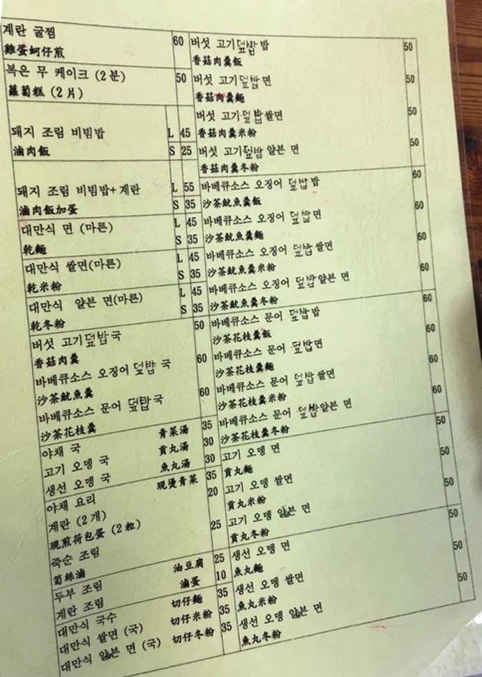 돼지 조림 비빔밥 작은 사이즈, 따뜻한 대만식 국수, 바베큐 오징어 소스 덮밥면 이렇게 3가지를 시켰습니다. 총 145 대만달러로 5천6백 원 정도입니다. 정말 싸죠? 계란 굴찜도 유명한데 굴이 안 당겨서 주문하지 않았어요.