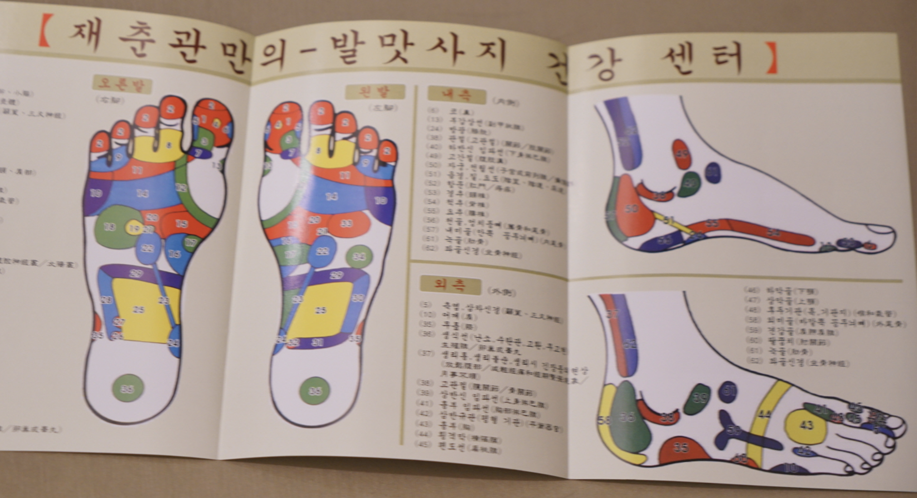 따로 다른 방에 가서 편한 바지를 주고 그걸로 갈아입도록 했습니다. 그리고 담당 마사지사가 발마사지 받는 자리를 안내해줍니다. 마사지사가 발을 씻어주시고 마사지 크림을 바르고 마사지를 해주었습니다. 마사지에 대한 설명이 쓰여있는 종이를 줍니다. 이 종이에는 발모양에 해당 부위가 지압을 하면 신체에 어떤 곳과 연결이 되어있는지 표기가 한글로 되어있습니다. 특히 통증을 느끼는 부분은 몸에서 안 좋거나 피로도가 높은 곳이라고 하네요. 중간중간 영어이긴 하지만 어느 부위인지 설명도 해주십니다.