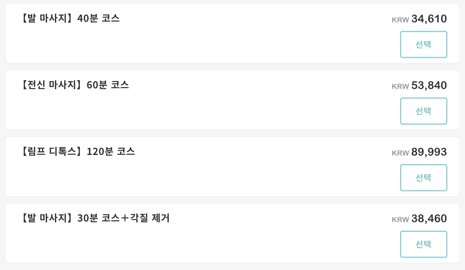 알아보던 중 KKday에서 예약해서 가면 더 싸다고 해서 미리 구매하고 갔습니다. 예약 가능한 마사지 종류는 발마사지, 전신 마사지, 림프 디톡스, 발마사지+각질 제거 이렇게 4가지 종류가 있고 저는 발마사지만 받았습니다. 아무래도 미리 바우처를 한국에서 구매 하면 자동으로 예약도 되기 때문에 혹시나 사람이 많아 기다릴 염려가 없어 편할 것 같았거든요.