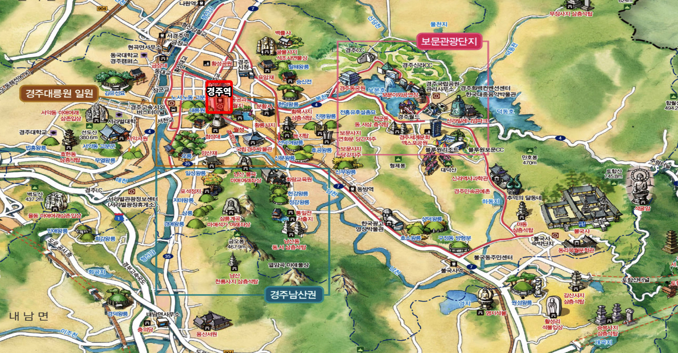 경주는 크게 경주 대릉원 인근, 보문관광단지, 불국사 석굴암 인근 이렇게 많이 여행합니다. 경주역은 경주 대릉원에 있고 보통 호텔들은 보문관광단지에 있습니다. 경주 대릉원에서 보문단지까지는 대략 차로 20분-30분 정도 거리로 왔다 갔다가 가능한 거리입니다.