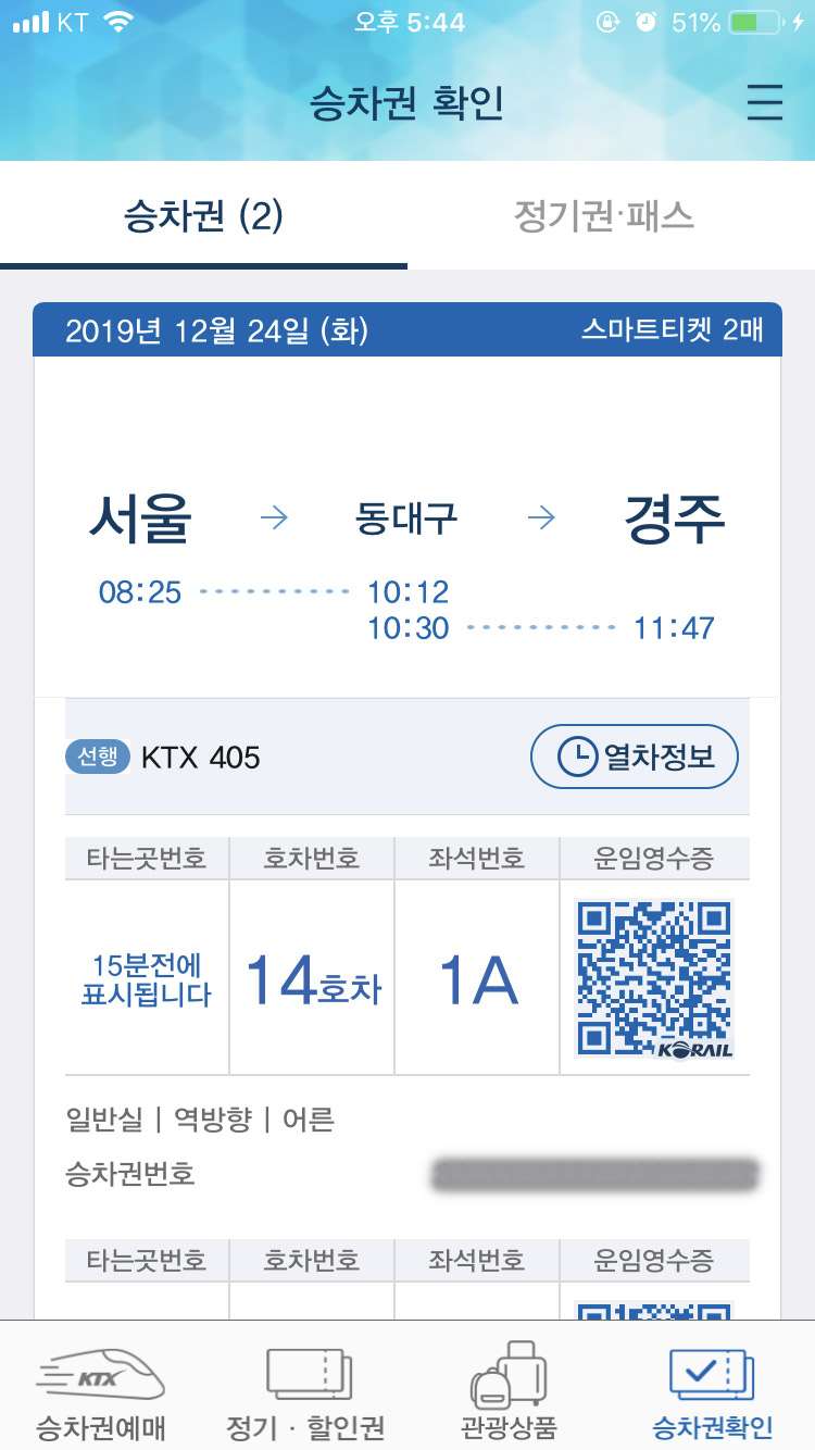 저도 이번에 알았는데 SRT, KTX는 경주역에 가지 않습니다. 처음에 열차 티켓이 왜 안 팔지 했었다는..; SRT, KTX는 신경주역은 가는데 신경주역에서 경주 시내까지 차로 30분 가야 하기 때문에 호텔 숙소까지 가면 1시간 거리라 그렇게 가지 않고 KTX로 동대구까지 가고 경주까지 가는 새마을호로 갈아타서 갔습니다. KTX사이트에서 경유로 선택하면 티켓 시간이 다양하게 나옵니다.