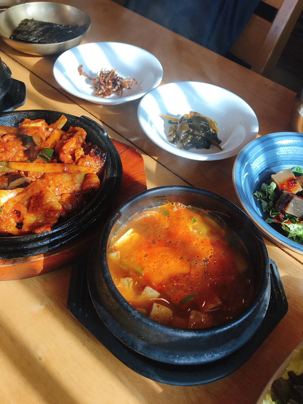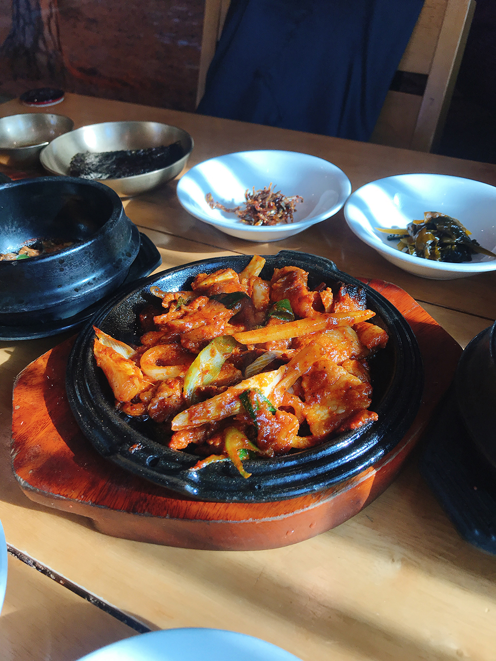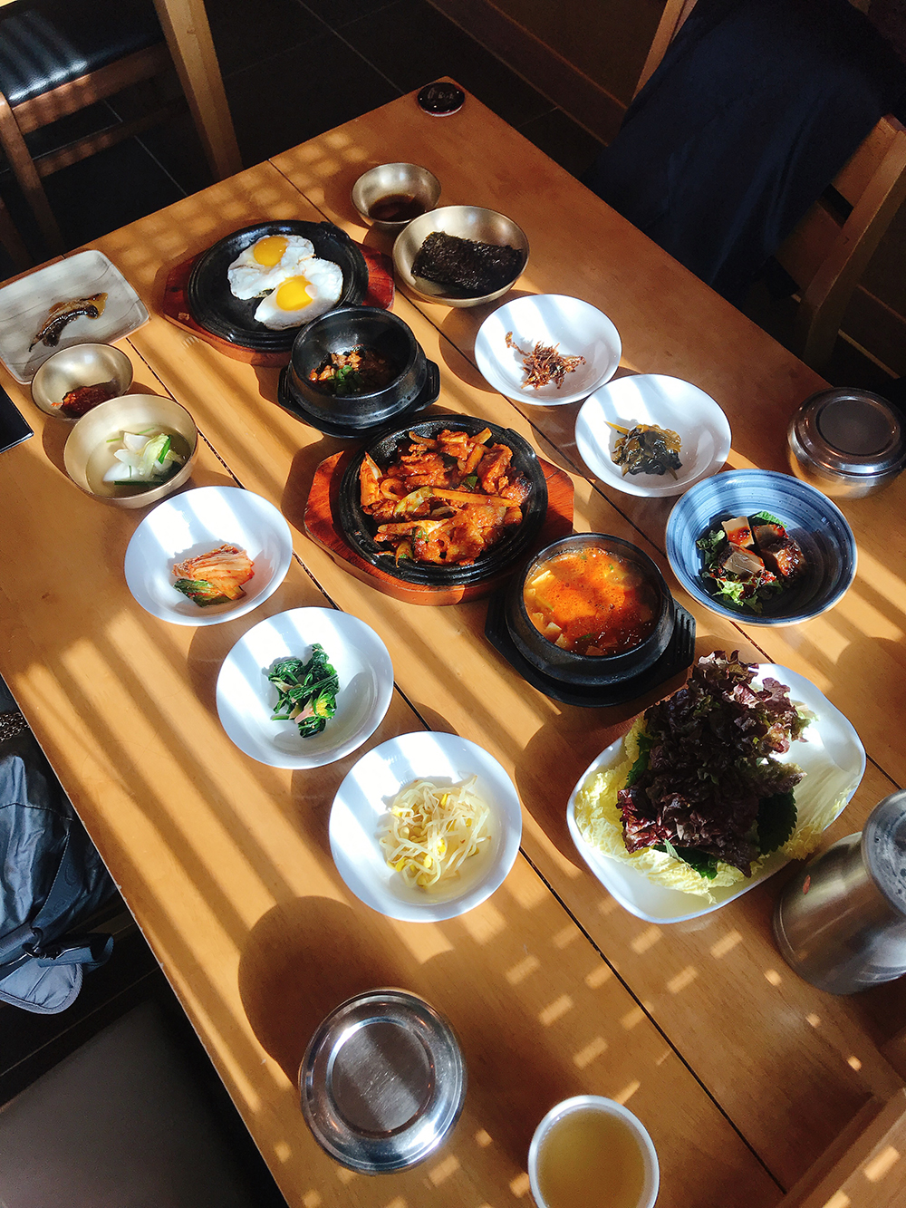 즐겁게 기다리고 나니 이렇게 거한 한상이 나왔습니다. 계란 프라이는 서비스로 주신 걸로 기억합니다. ㅎㅎ 반찬만 10개에 제육볶음과 된장찌개 그리고 강된장이 나왔어요. 1인 12,000원에 이렇게 거한 한상을 먹을 수 있다니 행복했습니다.