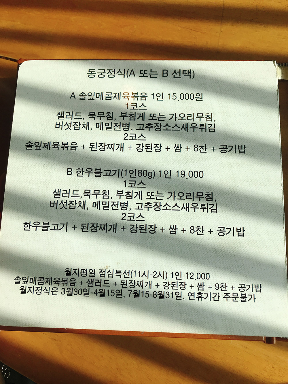 쓱쓱 주변을 살펴보니 대부분 동궁 정식(A 제육 코스 1인 15,000원이고 B 한우 불고기 1인 19,000원)이나 월지 평일 점심 특선(1인 12,000원)으로 선택하시고 거기에 추가로 떡갈비(1판 3조각 10,000원)를 시켜 드시는 것 같았습니다. 저는 월지 평일 점심 특선으로 2인분 시키고 커피를 바로 마시러 가고 싶어서 따로 추가 메뉴는 시키지 않았습니다.(떡갈비도 유명한 것 같은데 시키지 못해 아쉽)