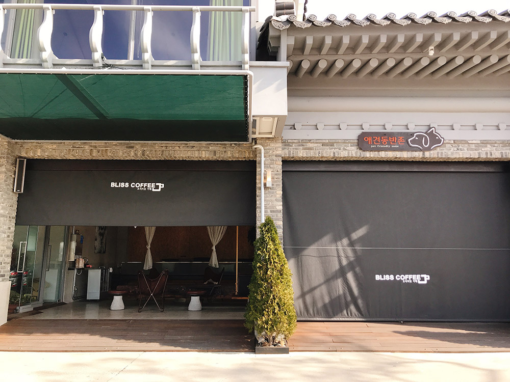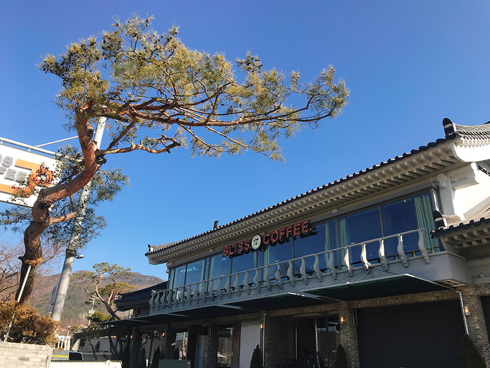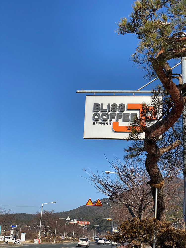 앞에 소나무가 매우 인상적이었습니다. 꺾여있는 소나무가 블리스 커피로 향하라는 것 같았죠.ㅎㅎ(감정 이입) 건물 외곽은 기와집 형태로 독특해 보였습니다. 전체적으로 지은 지 얼마 안 된 새 건물 느낌이 났어요. 다소 시간이 이른지 사람이 많지 않고 조용해 보였습니다.