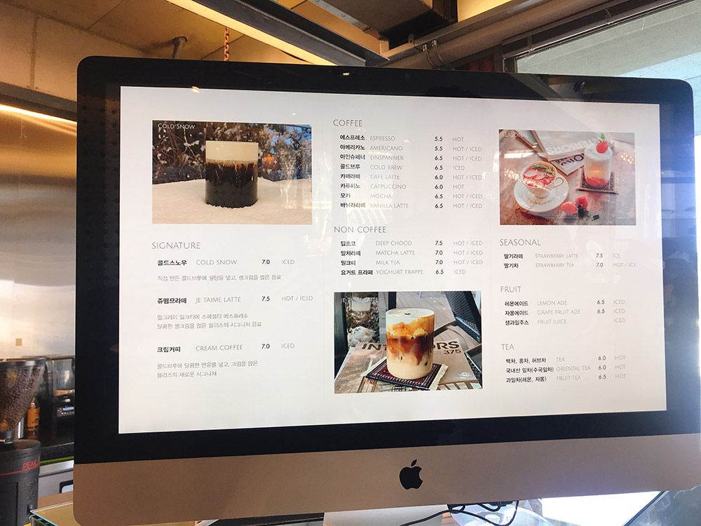 메뉴는 아이맥 스크린으로 볼 수 있었습니다. (경주는 아이맥으로 메뉴를 많이 보여주네요?ㅎ) 음료는 시그니처 음료 3개에 커피류와 티, 밀크티 등 커피 외에도 마실 음료 종류가 많았어요. 시즌 음료로 딸기 음료도 나와있었습니다. 음료 가격은 황리단길과 비슷한 편 같고 편한 자리를 생각하면 가격이 나쁘진 않았던 것 같습니다. 아인슈페너 6,500원 카페라테 6,000원 딸기 페스츄리 4천 원 총 18,500원이 나왔습니다.