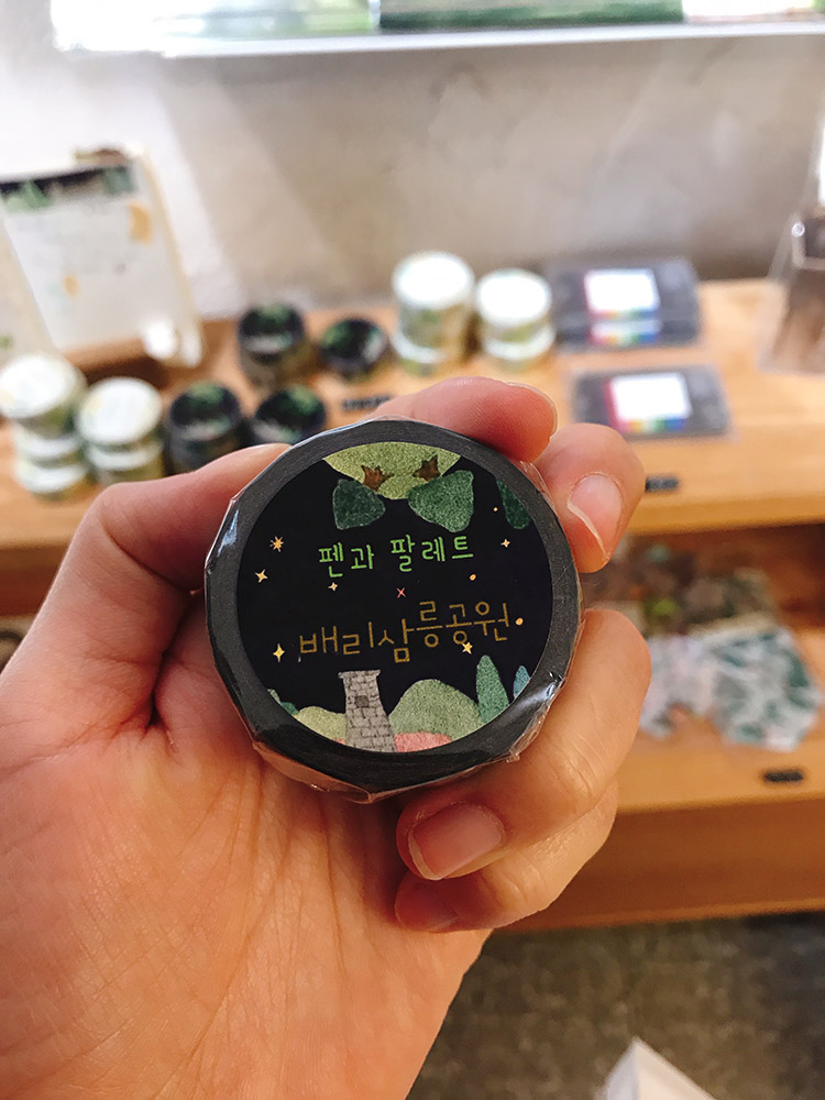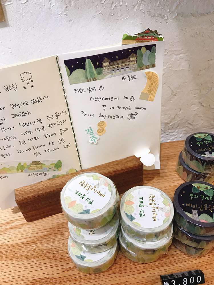 정말 이것저것 다 사고 싶었는데 일행의 만류(왜죠)로 이 독특한 마스킹 테이프를 하나 샀습니다. 얇은 건 3,800원이었고 약간 도톰한 사이즈라 도톰한 걸로 4,500원 주고 샀습니다. 보통 마스킹 테이프가 어두운 색이 잘 없잖아요? 이건 경주의 밤을 나타내는 느낌이라 고민 없이 바로 픽! 했습니다. 너무 이뻐요ㅠ