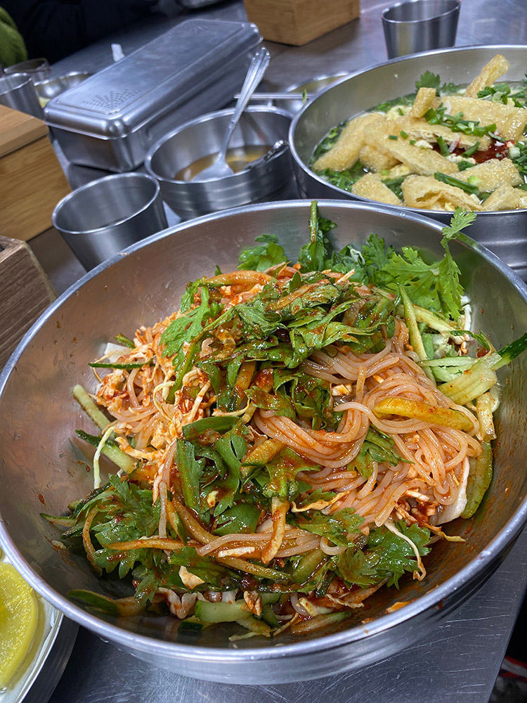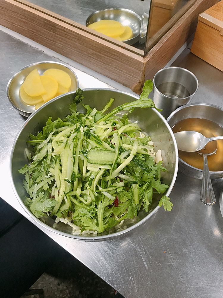 잠시 후 비빔 쫄면이 먼저 나왔습니다. 비주얼 좀 낯설.. 채소가 한가득 올라가 있어 아래 양념장이 안 보이는 쫄면입니다. 오이가 엄청 많이 들어가 있어서 오이를 싫어하시는 분들은 미리 말씀해야 할 것 같아요. 근데 쫄면에는 오이가 생명이라 넣어 드시길 추천합니다ㅠ