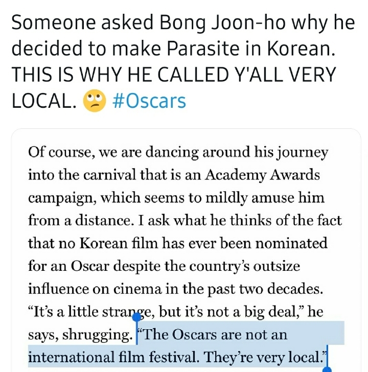 예전에 어떤 다른 인터뷰어가 왜 한국 영화가 아카데미 시상식에서 상을 받지 못했었는지 물어보자 봉준호 감독은 이에 뭐 별거 아니다 로컬 시상식 아니냐라는 말로 많은 팬들에게 띵언이 되었던 적이 있기에...