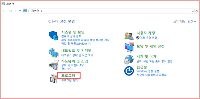KB4524244 업데이트 설치 여부를 확인하기 위해서는 먼저 제어판을 열어서 컴퓨터 설정 변경에 있는 프로그램에 들어갑니다.
